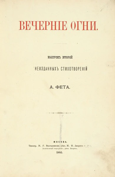 Во многих произведениях А. А. Фета есть образы, связанные со светом или огнём, наделённые разным смыслом. Вечерняя или утренняя заря, свет луны и звёзд, мерцание свечи и пламя костра. Название сборника «Вечерние огни» также содержит этот образ. В стихотворении «Когда читала ты мучительные строки…» (1887) вечерняя заря становится символом любви героя. В финале этот образ внезапно превращается в трагическую метафору уничтожающего, смертельного огня: «Ужель ничто тебе в то время не шепнуло: / Там человек сгорел!»[6].