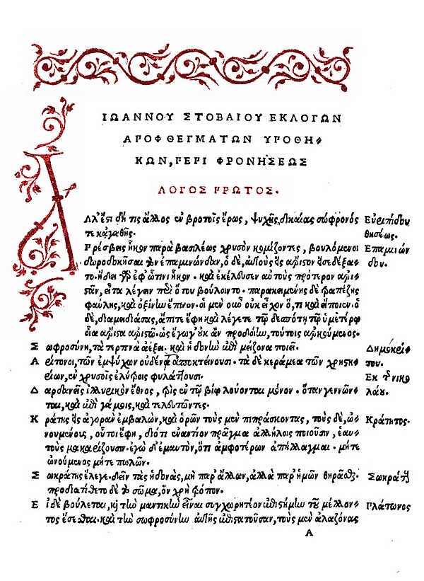 - Ioannis Stobaei. Anthologii libri duo priores qui inscribi solent Eclogae physicae et ethicae / (изд.) Kurt Wachsmuth, Otto Hense. — 2 Bde. — Berlin 1884—1923. (Переизд.: Nachdruck: Weidmann, Berlin, 1958).