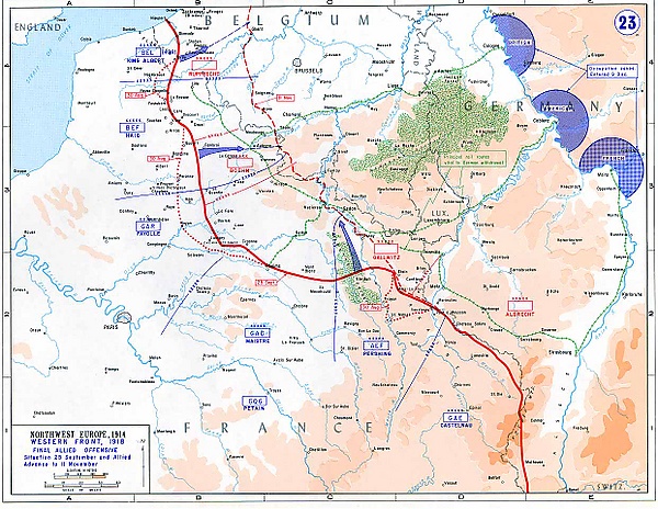 29 сентября южнее 3-й армии в районе Сен-Кантена и Ла-Фера в наступление перешли 4-я английская и 1-я французская армии. К исходу дня 30 сентября позиция Зигфрида была прорвана на 30 км по фронту и на 11 км в глубину. Дезорганизованные германские войска начали отходить.