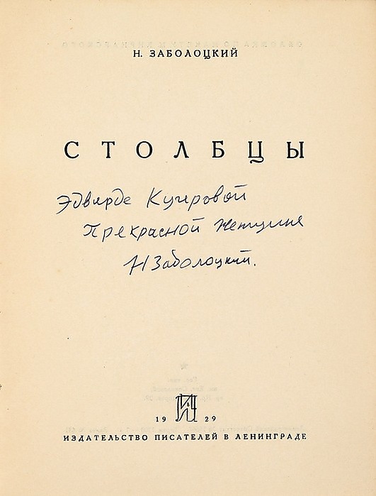 В 1929 году цикл «Столбцы» вышел отдельной книжкой в Издательстве писателей в Ленинграде. Исаак Синельников вспоминал, как они с Заболоцким работали над корректурой сборника[3]: