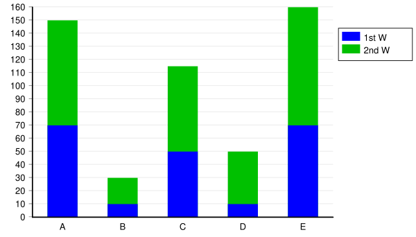 Стековая гистограмма отображает зоны, представляющие свойства одной категории, друг поверх друга для сравнения свойств в рамках одной категории. Стековая гистограмма не подходит в тех случаях, когда используются и отрицательные значения свойств. В таких случаях предпочтительнее группированная гистограмма.