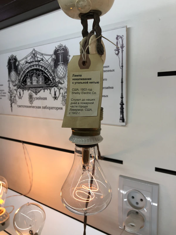«Столетняя лампа» произведена «The Shelby Electric Company», Шелби, штат Огайо, США. Лампочка рассчитана на напряжение 110 вольт, мощность лампочки 16 свечей, что ориентировочно составляет 30 ватт потребления. В настоящий момент она подключена к источнику напряжения в 56 вольт, что с учетом увеличения сопротивления нити накала при уменьшении температуры составляет около 8 ватт, примерно как ночные лампы.