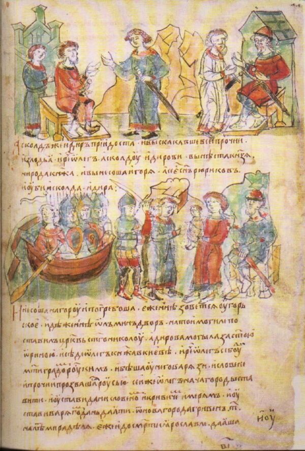 Вне контекста легенды о призвании варягов указание на первоначальное старшинство новгородского региона имеется у арабского географа Ибн Хаукаля, который называет его (ас-Славийю) главным среди трёх центров русов[12], и в сообщении Лаврентьевской летописи, где приводятся слова, с которыми в 1206 году владимирский князь Всеволод Большое гнездо отправлял собственного сына Константина в Новгород на княжение: «А Новъгород Великый старейшиньство имать княженью во всей Русьской земли».[13][14]