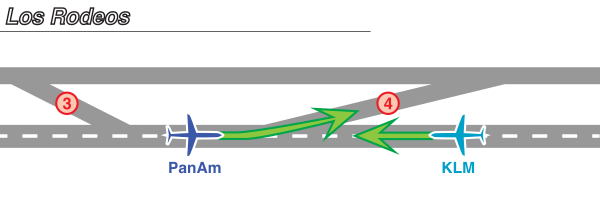 Командир Boeing 747 Pan American почти сразу же получил указания рулить вслед за Boeing 747 KLM. Ему было указано следовать по той же ВПП и свернуть на рулёжную дорожку C3, после чего двигаться по главной рулёжной дорожке к началу ВПП. Однако, достигнув дорожки C3, экипаж рейса 1736 отметил, что для того, чтобы свернуть на неё, им нужно повернуть на 135°, что практически невозможно для Boeing 747 на столь узкой полосе. По этой причине экипаж решил, что диспетчер приказал им свернуть на дорожку C4, которая находилась дальше по ВПП и требовала поворота лишь на 45°, хотя диспетчер ясно приказал сойти на C3.