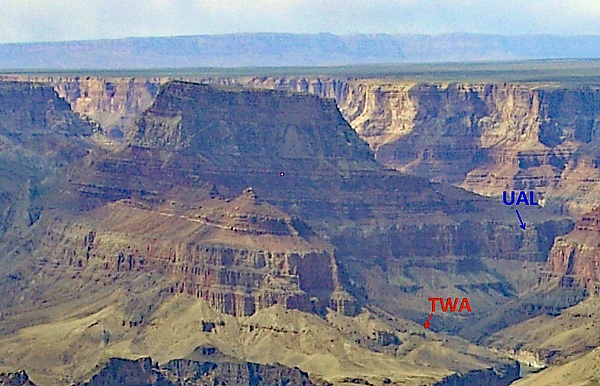 Утром 30 июня два брата Генри и Пален Хаджины (англ. Henry and Palen Hudgin), работавшие в авиакомпании Grand Canyon Airlines, совершали экскурсионный полёт неподалёку от устья Литл-Колорадо. Они увидели столб дыма, исходящий с одного из склонов останца Храм, но решили, что дым вызван ударом молнии (над каньоном в тот день были большие грозовые облака). Но вскоре после возвращения на аэродром братья узнали об исчезновении двух гражданских самолётов. Поэтому Генри и Пален сели на самолёт Piper Tri-Pacer и полетели к месту обнаружения дыма. При пролёте на небольшой высоте они увидели большой обломок, в котором смогли опознать хвостовое оперение от Lockheed L-1049-54-80 Super Constellation. В нескольких метрах они вскоре увидели основные обломки лайнера TWA, но не увидели среди них никаких признаков выживших. Из-за наступающей темноты Генри и Пален не смогли найти лайнер UAL и были вынуждены вернуться. Утром в воскресенье 1 июля они вновь вылетели к первоначальному месту обнаружения обломков, и вскоре близ слияния рек Колорадо и Литл-Колорадо на склоне останца Чуар, в 1,9 километрах от L-1049, они обнаружили обломки Douglas DC-7[2][5].
