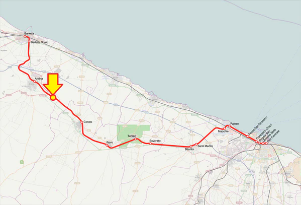 Поезда Stadler FLIRT (ETR-340 и Alstom ELT-200 (Coradia)[3][5]. Первый поезд двигался на юго-восток от Андрии, другой поезд направлялся от города Корато, в северо-западном направлении[3], на момент столкновения оба поезда двигались на высокой скорости[3]. Ведущая пара вагонов ETR-340 и ELT-200 сошла с рельсов[6], ещё три были уничтожены[6].