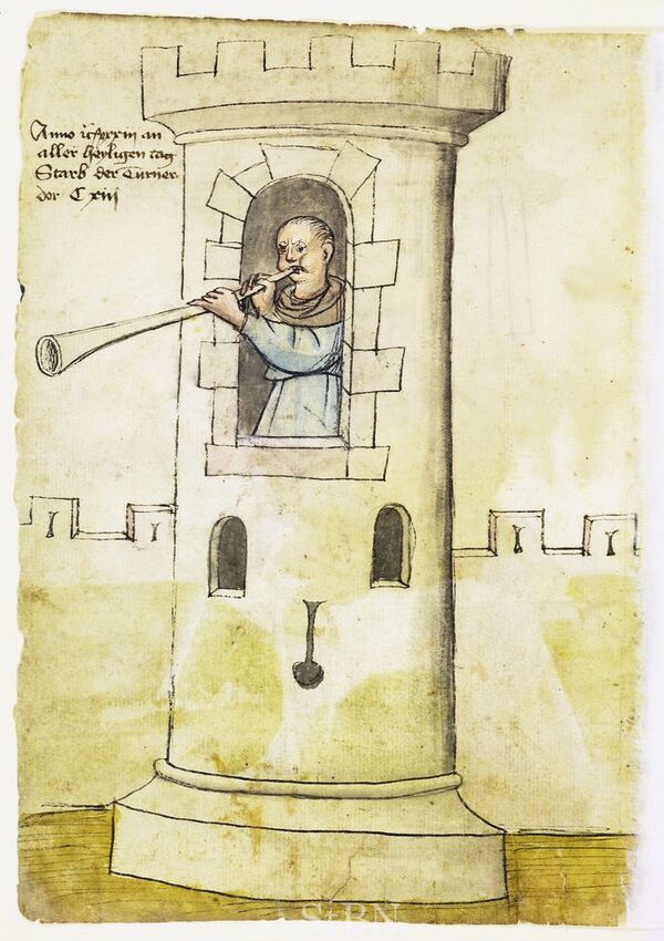 Главной задачей башенного сторожа, находившегося на самой высокой башне или колокольне города либо замка, было предупредить об опасности. В обязанности сторожа входило трубить в рог при восходе и закате солнца, при отправлении хозяина замка на охоту и возвращении с нее, при приезде гостей, при появлении врага, при пожаре и т. п.[29]. Считалось, что сторожить на башне являлось самой тяжелой из повинностей: сторожу приходилось испытывать холод, непогоду, требовалось с постоянным вниманием следить со своего высокого поста за всем, происходившим как в замке (городе), так и в его окрестностях. Довольно часто сторож жил в башне. Еще одной обязанностью сторожа также мог быть почасовой удар в колокол в определенное время.