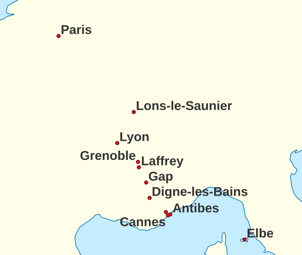 В три часа дня 1 марта 1815 года Наполеон и его маленькое войско достигли берегов Франции и высадились в бухте Жуан. Прибывшая таможенная стража радостно приветствовала их. Однако попытка войти в ближайший город Антиб закончилась провалом: после того, как 25 солдат Наполеона вошли внутрь, гарнизон закрыл крепостные ворота, и успевшие войти были пленены. В 11 часов вечера отряд Наполеона двинулся дальше[7].