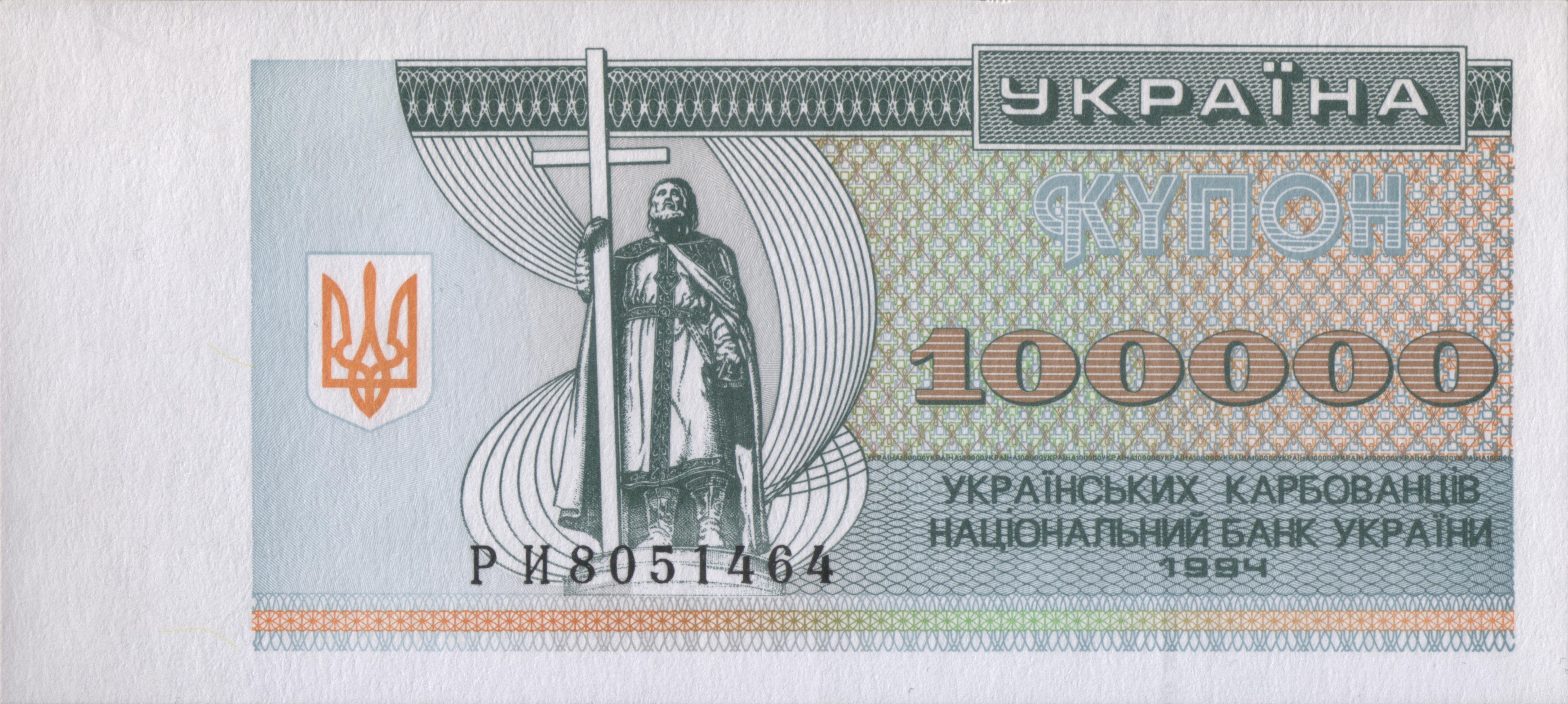 Первые банкноты номиналом 100 000 карбованцев были изготовлены британской фирмой «Томас де ла Рю» в 1993 году. В 1994 году банкноты также выпускались на Банкнотно-монетном дворе Национального банка Украины.