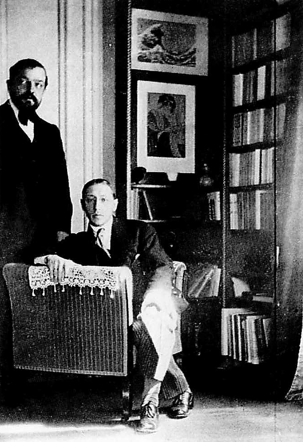 В июне 1911 года, вскоре после парижской премьеры «Петрушки» в «Русских балетах» Дягилева, Стравинский познакомился с Эриком Сати[13], которого определял как «самого странного человека, которого когда-либо знал», но притом называл его «самым замечательным» и «неизменно остроумным»[14]. Осенью того же года состоялась встреча и фотографирование в доме Клода Дебюсси,[13] где в обстановке пообедали три композитора, имевших прямое отношение к стилю импрессионизм в музыке: его «предтеча» и основоположник (Эрик Сати),[15][16][17][18] общепризнанный глава (Клод Дебюсси) и русский последователь (Игорь Стравинский),[19][20][21] уже обозначивший своё движение к другим стилям.