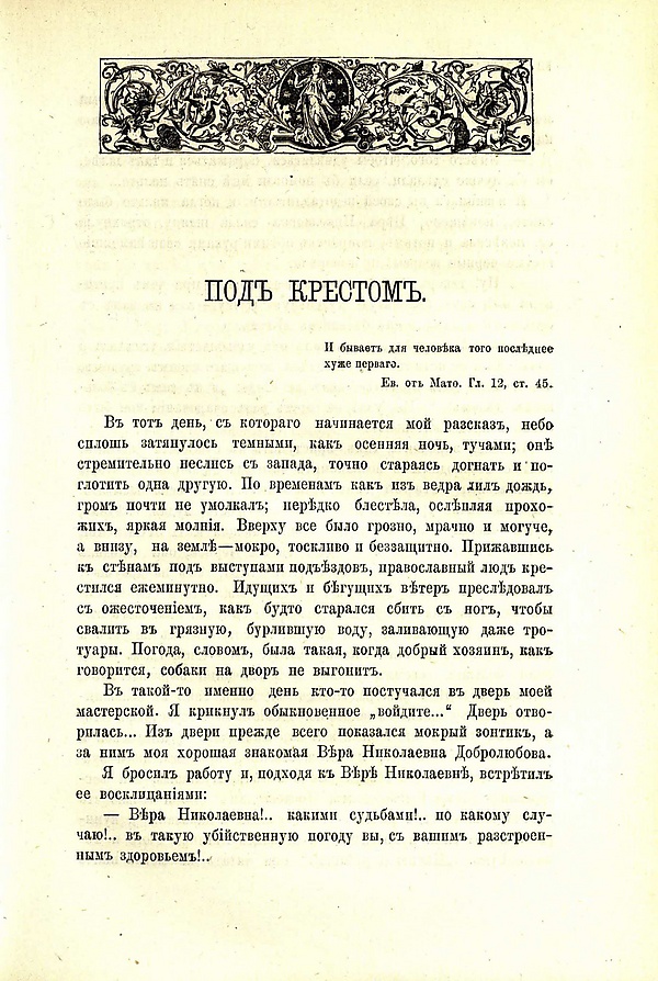 - Перов В. Г. Под крестом // Художественный журнал с приложением Художественного альбома. — Типография А. С. Суворина, 1881. — Июль (т. II, вып. 7). — С. 11—34.