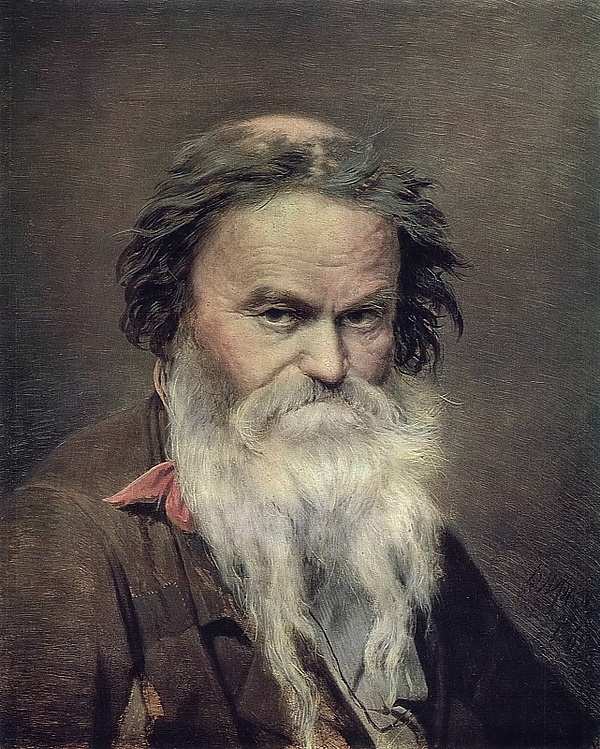 Как-то в ненастную осеннюю погоду в мастерскую к художнику зашла его хорошая знакомая — старая дева лет тридцати Вера Николаевна Добролюбова. Женщиной владели две страсти — к чтению и благотворительности[15]. Она рассказала художнику об одиноком и нищем старике 84 лет, которого случайно встретила. Старик — бывший крепостной какого-то князя, впоследствии побывавший в собственности у десятка господ, «к которым он переходил из рук в руки». После отмены крепостного права старик остался без крова, семьи, родственников и друзей. Он ходит из дома в дом, за плату где-то колет дрова, где-то носит воду или подметает двор. Ночует он, по предположению Веры Добролюбовой, «в поле, на кладбище или где-нибудь под мостом»[16]. Женщина просила художника, пользуясь знакомством, устроить старика в приют местного благотворителя и мецената Саввы Щукина. Уже на выходе она, «смотря на одну из начатых… картин, сказала: „А может старик и для вас пригодится, для вашей картины“»[17].