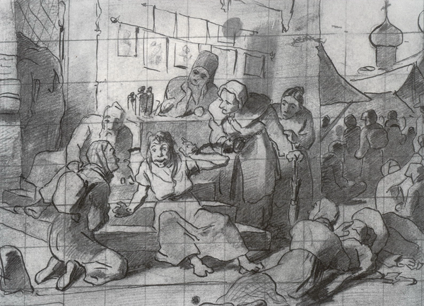 Странники, юродивые, сектанты и отшельники на картинах Василия Перова — носители и олицетворение тяжёлой судьбы человека, терзаемого неутолимыми духовными потребностями, которые часто приобретают уродливый вид. Иногда в произведениях художника трактовка подобных сюжетов имеет спокойный — «объективно-бытовой характер». Примером этого типа изображения является картина «Приём странника-семинариста» (1874), в которой действие происходит в опрятной деревенской избе, а две крестьянки разного возраста угощают обедом странника, встреченного ими «с уважением и сочувствием». Иногда интерпретация таких сюжетов имеет «напряжённо-драматический, резко экспрессивный характер». Особенно такая трактовка, по мнению искусствоведа Владимира Петрова, характерна для графических работ Василия Перова и его эскизов. Именно в них очевидны «нервная импульсивность и порой почти болезненная реакция на наблюдаемые им человеческие страдания и уродства»[29].