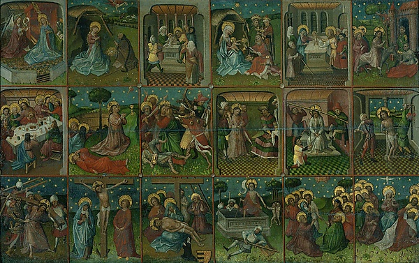 Мастера могли как посвящать каждой из Страстей отдельную работу, либо же совмещать в одном произведении сразу несколько сюжетов (один из примеров такого соединения — миниатюра Жана Фуке «Несение Креста»[99]). А на иконах, ретабло, алтарных образах и в произведениях декоративно-прикладного искусства сюжеты также могли располагаться клеймами подряд, в повествовательном цикле. Во фресковых циклах Страсти обычно изображались через последовательность эпизодов; гораздо реже использовался более эффектный приём — весь Страстной цикл помещался в городской пейзаж, изображавший Иерусалим, но приближённый к современной художнику городской среде[100].