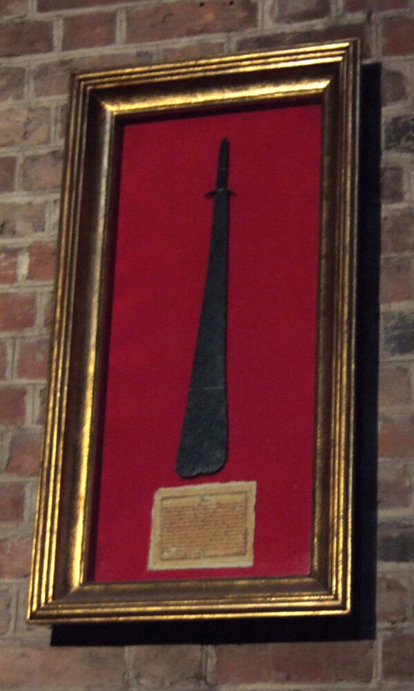 - меч[K 1] — им святой Пётр отсёк ухо Малху (иногда изображается с ухом);