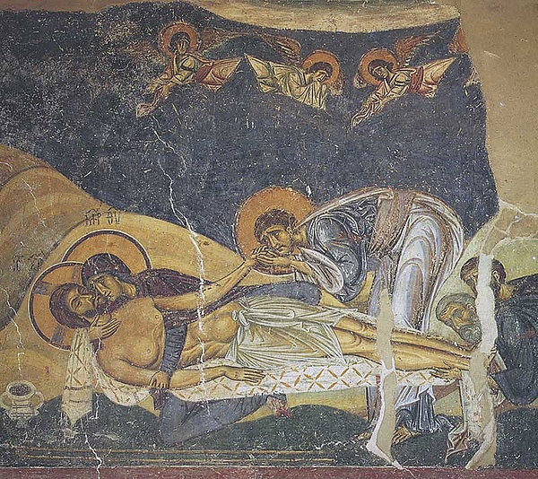 | Никодим принёс ароматы, вместе с Иосифом он подготовил тело Иисуса для погребения, завернув его в саван с миррой и алоэ. При этом присутствовали галилейские жены, которые оплакивали Христа[20]. | |||||