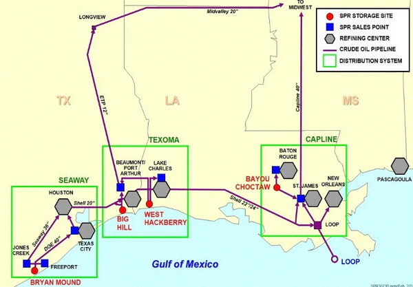- Bayou Choctaw — Батон-Руж, штат Луизиана. Ёмкость 76 миллионов баррелей, не более 0,55 млн в день. Планируется расширение на 109 миллионов, с увеличением пропускной способности на 0,6 млн баррелей в день.[15]