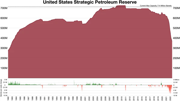 К 6 января 2023 года в Стратегическом нефтяном резерве США осталось лишь 371,580 млн. баррелей, что является худшим показателем с начала декабря 1983 года. Всего резервы за полный 2022 год (с января по январь) сократились на 221.802 млн. баррелей[3].