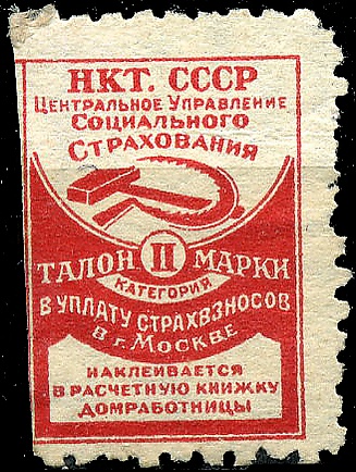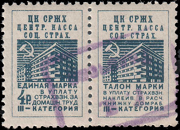В 1926 году состоялся выпуск знаков страховой уплаты Центрального комитета профессионального Союза работников городских предприятий и домашних работников (ЦК СРГП и ДР). На марке были изображены серп и молот и дан текст: «ЦК СРГП и ДР Центральная касса социального страхования … категория Единая марка в уплату страхвзносов за домашний труд». На талоне также было изображение эмблемы труда и текст: «ЦК СРГП и ДР Центральная касса социального страхования Талон марки … категории в уплату страхвзносов Наклеивается в расч[ётную]. книжку домработницы»[2].