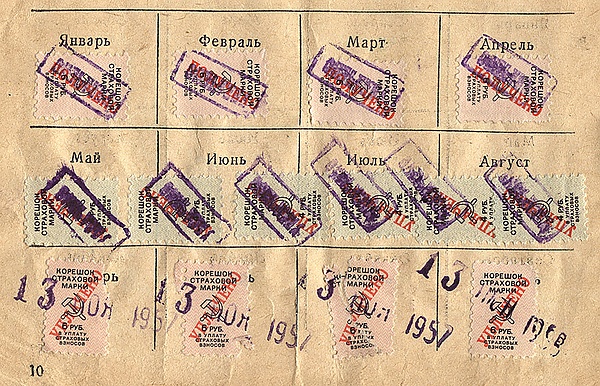 К 1926 году социальное страхование в СССР было передано из НКТ профессиональным союзам, в аппарате центральных комитетов которых были предусмотрены центральные кассы социального страхования, выпускавшие знаки уплаты страховых взносов. Наниматель прислуги уплачивал соответствующую сумму в кассу низовой профессиональной организации. Выдаваемый ему знак уплаты делился так, что марка наклеивалась в учётный документ, а талон — в расчётную книжку работника (иногда, наоборот)[2].
