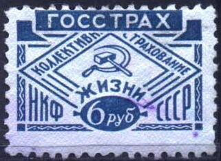 Для системы коллективного страхования Госстрахом было произведено шесть делимых знаков, использовавшихся при сборе страховых взносов и их учёте. Порядок сбора взносов был простой, понятный каждому участнику процесса страхования и позволял контролировать денежные операции. Первые пять марок Госстраха СССР вышли, предположительно, в 1932 году. Они представляли собой делимый знак: марку с изображением серпа и молота и текстом: «Госстрах СССР Коллективное страхование жизни» и талон с текстом: «Контрольный талон Страхования жизни Госстрах СССР». Марки второго выпуска были изданы также, предположительно, в 1932 году. Они повторяли рисунок и текст марок первого выпуска, но в изменённых цветах. Третий выпуск — вертикальная надпечатка на знаках первого и второго выпусков обозначений календарных кварталов года: «I квартал», «II кв-л», «III кв-л» и «IV кв-л», был сделан, предположительно, в 1937 году[2].