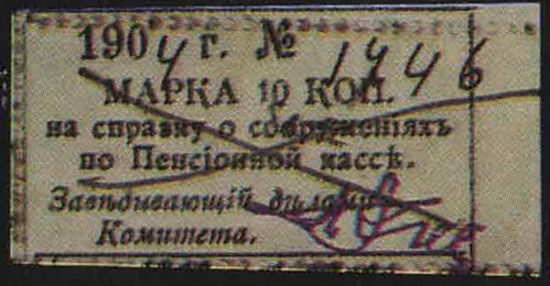 Служебные марки для пенсионных и эмеритальных касс Российской империи выпускались с 1900 по 1917 год. Известны марки двух видов. Марка номиналом 5 копеек — чёрная на зелёной бумаге, представляет собой делимый знак — квитанцию с талоном. На квитанции текст: «№ … Квитанция на … к. на право получения книжки из Пенсионной Кассы для записи взносов». Текст талона: «№ … Талон квитанции на … к. на право получения книжки из Пенсионной кассы для записи взносов». Марка номиналов 10 копеек, представляет собой отпечатанный типографским способом текст: «190. г. № … Марка … коп. на справку о сбережениях в Пенсионной Кассе. Заведующий делами Комитета» в рамке на белой или зеленоватой бумаге[2].