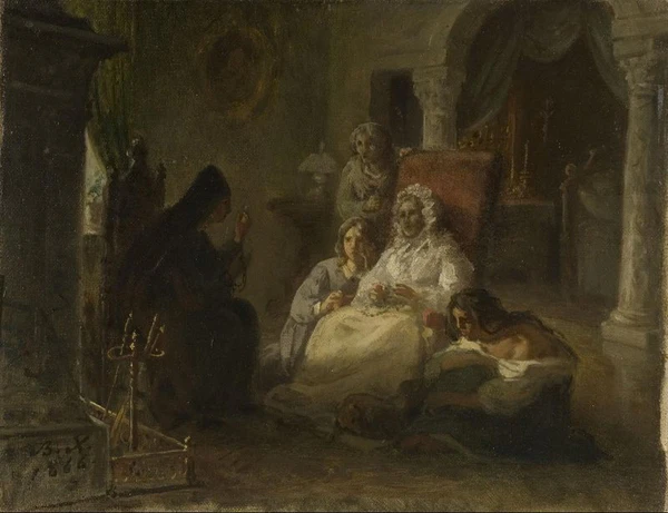 На картине изображены женщины, находящиеся в комнате; две из них сидят с чётками в руках. Сцена отражает типичный мотив бытового жанра, передавая атмосферу повседневной жизни и религиозной практики.