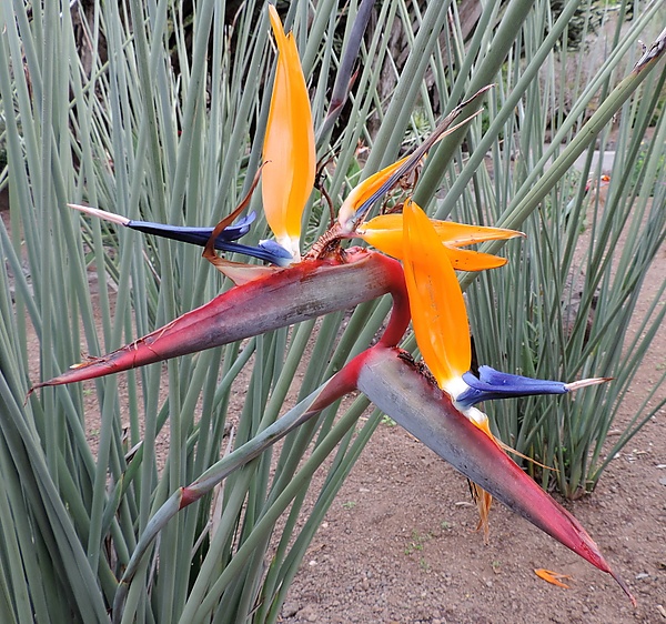 Цветки появляются из прицветника и раскрываются обычно по одному. Чашелистики около 12 см. длиной, жёлто-оранжевой окраски, в центре покрыты волосками. Лепестки ярко-голубые, два крайних сросшиеся, образуют капсулу в форме наконечника стрелы длиной около 6 см., в которую заключены тычинки, третий редуцирован до нектарника. При роспуске выделяется слизистая субстанция, привлекающая опылителей. Каждый цветок держится раскрытым около недели.