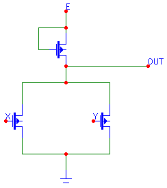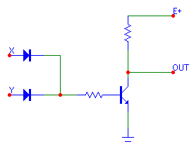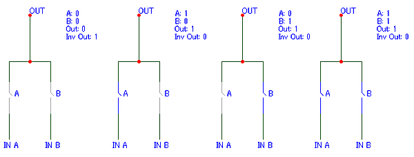 Говоря простым языком, вентиль 2ИЛИ-НЕ — это 2ИЛИ с подключённым к нему инвертором. Для наглядности — ниже приведён пример логической схемы 2ИЛИ-НЕ с выключателями. Как известно, логика 2ИЛИ близка к выражению «или A, или B, или то и другое». Чтобы получить операцию 2ИЛИ-НЕ, результат 2ИЛИ необходимо инвертировать, чтобы получить «не (A или B)». На схеме ниже это выглядит следующим образом: серым отмечены выключатели в состоянии «выключено», синим — в состоянии «включено». На верхней левой схеме оба выключателя находятся в положении «выключено». Таким образом, следуя выражению на выходе, получаем логический 0. Инвертированный результат будет равен 1 и тем самым будет логически удовлетворять выражению «не А, не B». Следующие схемы демонстрируют соответственно «ИЛИ А», «ИЛИ B», «И А, И B» с последующей инверсией результата. Слева представлены варианты реализации вентиля 2ИЛИ-НЕ с помощью диодно-транзисторной логики и с помощью МОП соответственно. Представленная схема на МОП выполнена на однотипных МОП-транзисторах, однако существуют вариант схемы 2ИЛИ-НЕ на комплементарных (дополняющих) МОП-транзисторах. Такую схему получают путём последовательного соединения однотипных транзисторов и параллельного соединения группы транзисторов другого типа.