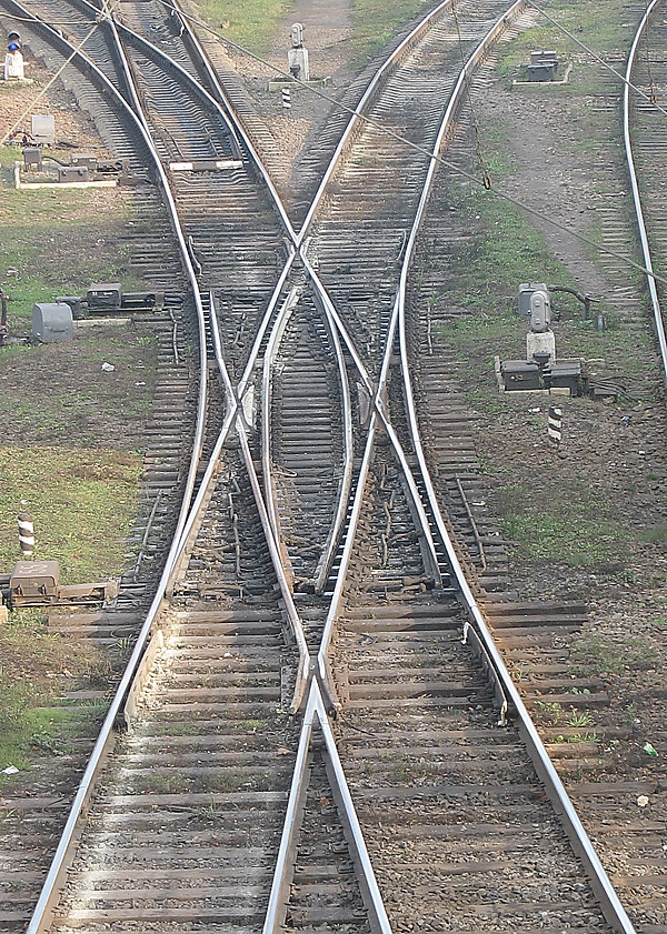 - двойные стрелочные переводы, в которых тесно соседствуют 2 стрелки, и один путь разветвляется на три;