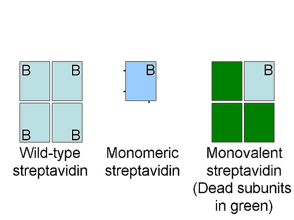 Стрептавидин представляет собой тетрамер, и каждая субъединица связывает биотин с одинаковым сродством. Мультивалентность является преимуществом в таких приложениях, как окрашивание тетрамера MHC, где эффекты авидности улучшают способность молекул MHC, присоединенных к стрептавидину, обнаруживать специфические Т-клетки[14]. В других случаях, таких как использование стрептавидина для визуализации специфических белков на клетках, поливалентность может нарушить функцию интересующего белка. Моновалентный стрептавидин представляет собой сконструированную рекомбинантную форму стрептавидина, который представляет собой тетрамер, но только один из четырёх сайтов связывания является функциональным. Этот единственный сайт связывания имеет аффинность 10−14 моль/л и не может вызывать перекрестное связывание[15]. Применения моновалентного стрептавидина включали флуоресцентное отслеживание рецепторов клеточной поверхности, украшение оригами ДНК и действие в качестве указателя для определения конкретных областей для криоэлектронной микроскопии.