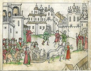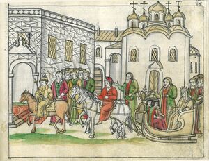 «Бракосочетание царя происходило 5 февраля, и все лица были по особенному царскому приказу без мест. Осторожности сей научил опыт первого бракосочетания. Главным распорядителем был боярин Иван Романов, а дружками при государе — князья Дмитрий Черкасский и Дмитрий Пожарский, при государыне — Борис Шеин и Роман Пожарский. В свадебном поезде в церковь ехал государь верхом на аргамаке, а государыня в санях. На другой день прибыли к царю Михаилу Фёдоровичу с дарами бояре, думные люди, гости, и гостинной, и суконной, и чёрной сотни торговые люди. Царь приказал их допустить к себе, но даров не принял. В последнем случае поступил царь Михаил Фёдорович вопреки прежним обычаям и, вероятно, имел на то особые причины.»[9].