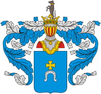 Описание герба: В щите, имеющем голубое поле, изображена серебряная подкова и над ней золотой крест. Щит увенчан дворянским шлемом с дворянской на нем короной, на поверхности которой выходящая собака в золотом ошейнике. Намет на щите голубой, подложенный серебром. |