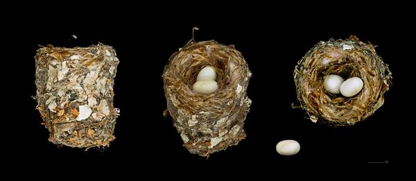 Строительством гнезда колибри — чаще всего чашеобразного, из растительных волокон, паутины, кусочков коры и лишайников — занимаются самки[10]. Типичные колибри обычно строят открытые гнёзда, в которые можно попасть с лёта. Их гнёзда обычно двуслойные: за внешним камуфляжным слоем из грубых материалов следует внутренний мягкий слой, способствующий оптимальной изолированности от внешней среды[50]. Гнёзда колибри-отшельников существенно отличаются, представляя собой подвешенные плетённые корзины[10] или другие конструкции с открытыми стенками. Плохая изолированность компенсируется высокой температурой окружающей среды, кроме того, сквозь такую конструкцию проходит много света, а дождевая вода протекает сквозь гнездо и не оказывает влияние на яйца[50]. Крайне редко колибри образуют гнездовые скопления[53].
