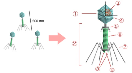 - Хвоста — полая белковая трубка, по которой генетический материал вводится в бактериальную клетку.