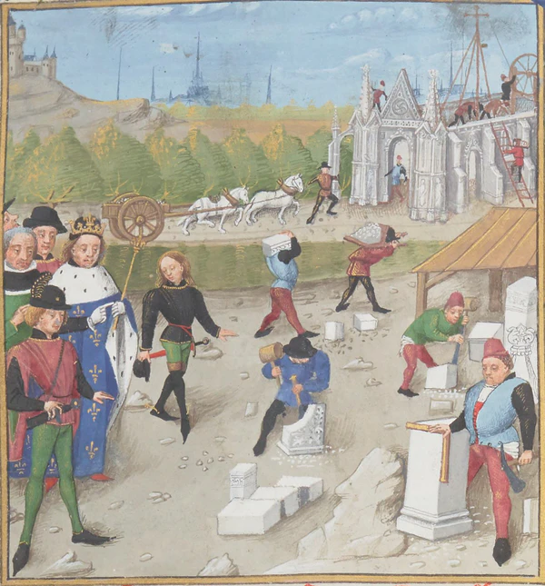 Каменотёсы, кладчики, плотники и другие рабочие были высококвалифицированными, но обычно неграмотными. Ими руководили бригадиры, которые подчинялись мастеру-каменщику. Бригадиры использовали такие инструменты, как циркуль, для измерения и увеличения чертежей до полного размера, а также уровни со свинцом в стеклянных трубках, чтобы убедиться, что блоки выровнены. Каменщики использовали аналогичные инструменты, чтобы убедиться, что поверхности были ровными, а края — под точным прямым углом[22]. Их инструменты часто изображались на средневековых миниатюрных рисунках того периода.