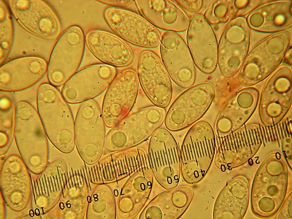 Споры размером 18—23 × 9—12 мкм, эллиптической формы, гладкие, бледно-жёлтого цвета. Каждая спора содержит две капли масла и на ощупь слегка маслянистая[25][26].