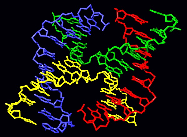 Формы, лишённые стэкинга, имеют почти плоскую квадратную структуру. Конформеры со стэкингом состоят из двух двуцепочечных доменов, расположенных под углом 60° по правилу правой руки. Две из четырёх цепей (по одной из каждого домена) сохраняют спиральную структуру, а две другие переходят из одного домена в другой антипараллельным образом[2].