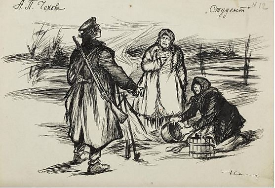 «Студент думал о Василисе: если она заплакала, то, значит, всё, происходившее в ту страшную ночь с Петром, имеет к ней какое-то отношение…» Юноша думал о том, «что если Василиса заплакала, а её дочь смутилась, то, очевидно, то, о чём он только что рассказывал, что происходило девятнадцать веков назад, имеет отношение к настоящему — к обеим женщинам и, вероятно, к этой пустынной деревне, к нему самому, ко всем людям. Если старуха заплакала, то не потому, что он умеет трогательно рассказывать, а потому, что Пётр ей близок, и потому, что она всем своим существом заинтересована в том, что происходило в душе Петра».