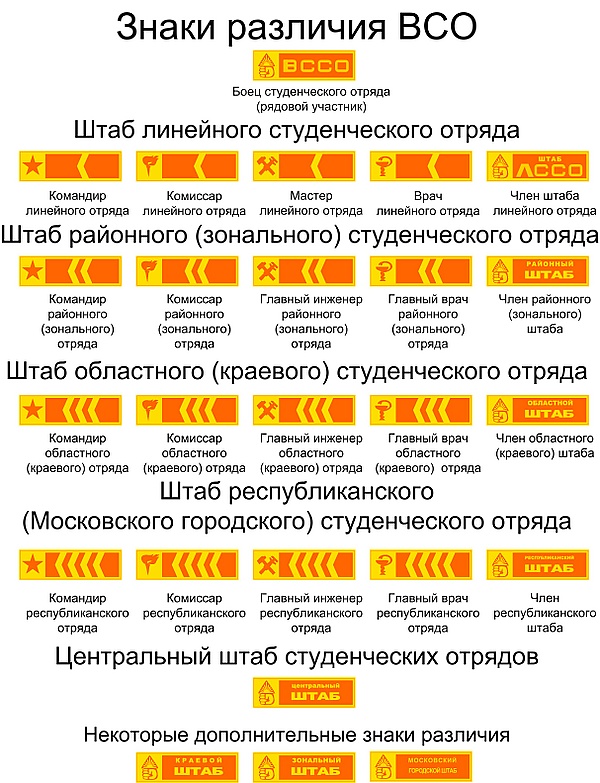 - Комиссар — руководитель отряда наравне с командиром. Формально должность комиссара ССО была «выборной», однако отбор и утверждение на неё было исключительной прерогативой парткома (партбюро) учебного заведения, действовавшего на основании формального представления комитетом ВЛКСМ «выбранной» кандидатуры. По общему правилу, в комиссары назначались члены КПСС, кандидаты в члены КПСС или комсомольские активисты, внесённые в негласную «очередь» на приём в КПСС. Часто комиссарами ВССО посылали не студентов, а аспирантов или младших сотрудников из преподавательского состава. Отвечая, подобно армейским замполитам, за политическую и культурно-массовую работу, комиссары становились во главу неуставной комсомольской организации ВССО, имея право ставить на её собраниях вопрос вплоть до исключения нарушителей из ВЛКСМ (и ВУЗа).