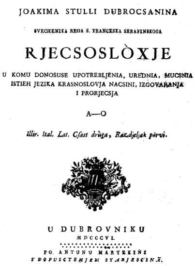 У Стулича возникли трудности с публикацией словаря. После нескольких безуспешных попыток напечатать словарь в 1782 году он обратился к австрийскому императору Иосифу II, имевшему планы издать единый словарь для всех славянских народов монархии с единым написанием и добавлением немецких слов. Стулич писал дубровникско-далматинским языком. Поскольку словарь должен был получить одобрение австрийских властей и использоваться в более широкой лингвистической области, в 1785 году в Вене был создан специальный комитет, которому было поручено редактировать словарь. Комиссия решила, что словарь может быть издан после его переработки в славянской графике, введенной несколькими годами ранее в народных школах Хорватии, Славонии и Венгрии того времени. Также было предложено ввести в словарь немецкие слова. Епископ Антун Мандич особенно способствовал окончательному редактированию и печати словаря. Стулич пересмотрел орфографию и правописание иллирийской (хорватской) части словаря. В 1801 году в Буде вышла первая часть словаря с посвящением австрийскому императору Иосифу II и за его счёт.