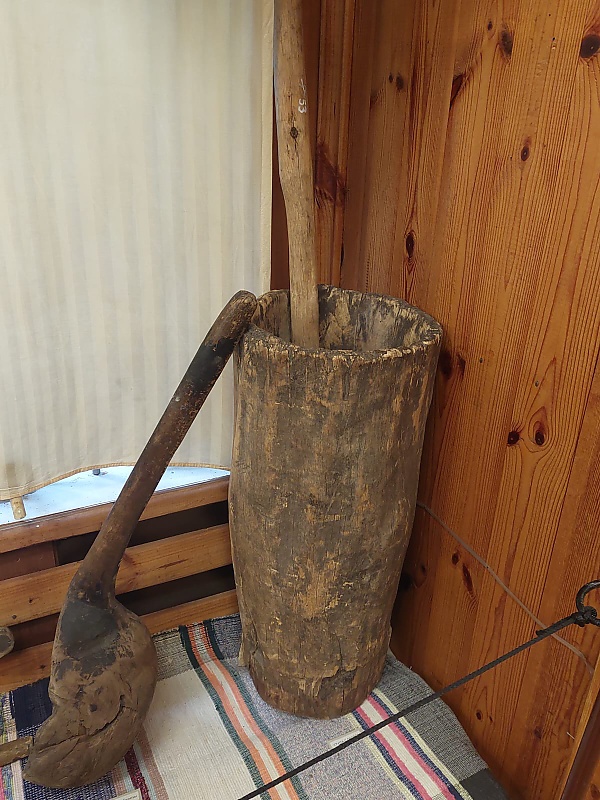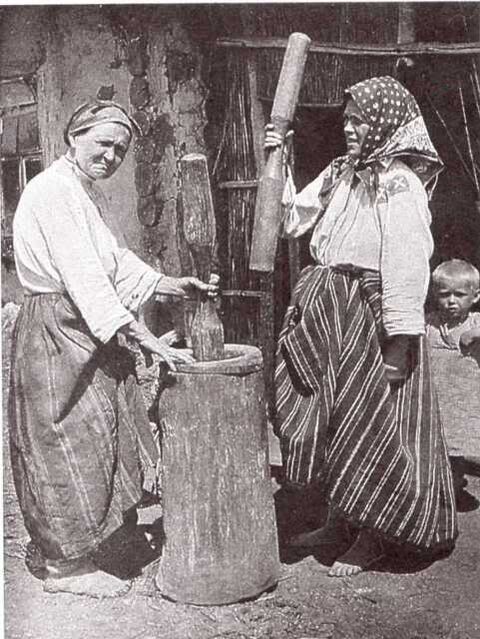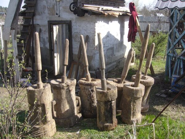 В больших деревянных мельничных[Д 2] ступах (высотой до 80 см[12]), сделанных из выдолбленной колоды[Д 2] осины или берёзы (толстого и короткого отрезка ствола дерева), отделяли оболочку (обрушивали) и перемалывали зёрна пшеницы, ячменя, проса, гречихи[12]. Полученную массу могли просеивать в ситах — например, так делали овсяную муку толокно. Толчение было одним из этапов приготовления льняного и конопляного[13] масла[14].