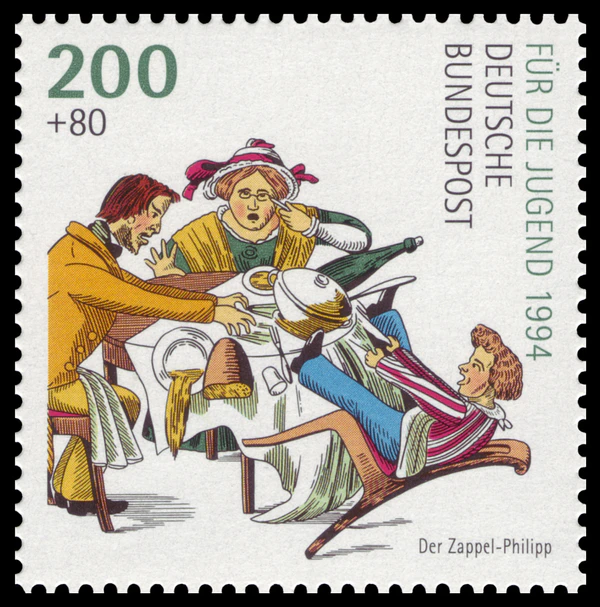 - о Конраде, который любил сосать палец, несмотря на замечания мамы, и когда он в очередной раз ослушался, пришёл портной с ножницами и отрезал ему два больших пальца;