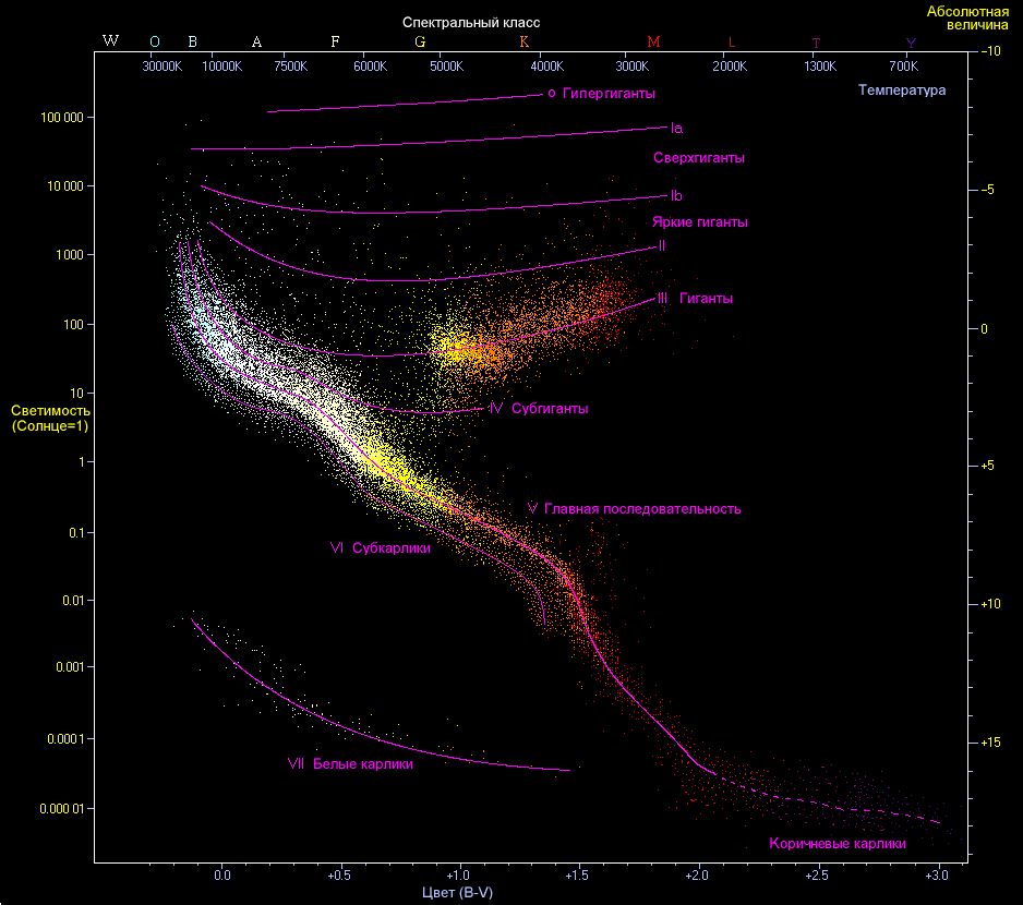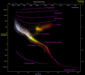 Диаграмма Герцшпрунга — Рассела для звёзд в окрестностях Солнца с отмеченными классами светимости, в том числе субгигантами | |