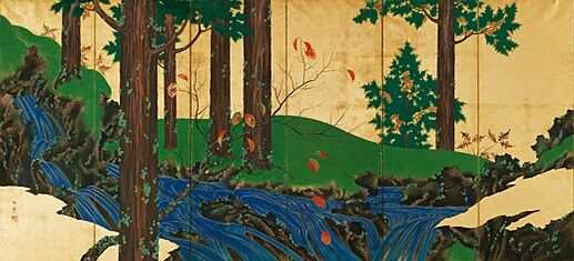 Горный поток летом и осенью — шестистворчатая ширма, созданная Киицу при помощи чернил и краски на позолоченной бумаге[8]. На ширме изображён горный пейзаж с кипарисовыми рощами, лилиями и вишнями. В одном из исследований изображение на ширме охарактеризовали как «по-странному нереальное» и приписывали ему некие черты гиперреализма[9].