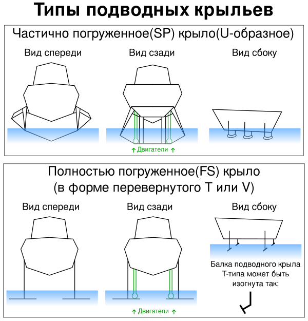 Существует два типа подводных крыльев — частично погружённое крыло (или U-образное крыло) и полностью погружённое крыло (крыло в форме перевёрнутого Т).