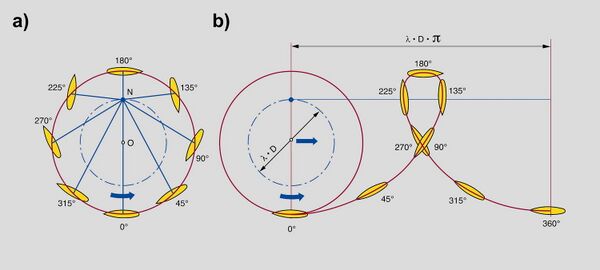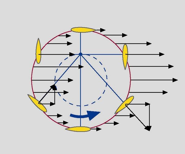 Движитель состоит из круглой пластины, вращающейся вокруг вертикальной оси, со множеством вертикальных лопастей. Каждая лопасть вращается вокруг вертикальной оси по эпициклоиде при помощи внутреннего механизма, который изменяет угол атаки лезвий в синхронизации с вращением пластины, так чтобы каждая лопасть могла обеспечить толчок в любом положении, подобно работе автомата перекоса в вертолёте.
