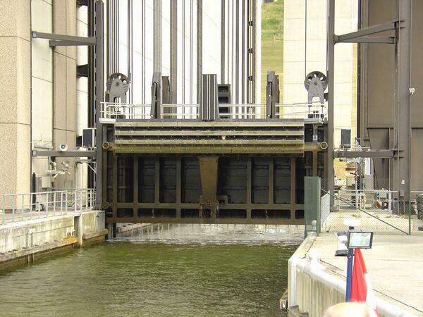 Длина судоподъёмника 130 м, ширина 81 м, высота 117 м. Для достижения жёсткости конструкции и высокой прочности при кручении он построен с использованием очень сильно армированного железобетона, поэтому масса составляет приблизительно 200000 тонн. Водонепроницаемые затворы камер выдерживают столкновение с судном водоизмещением до 2000 тонн, при скорости до 5 км/ч.