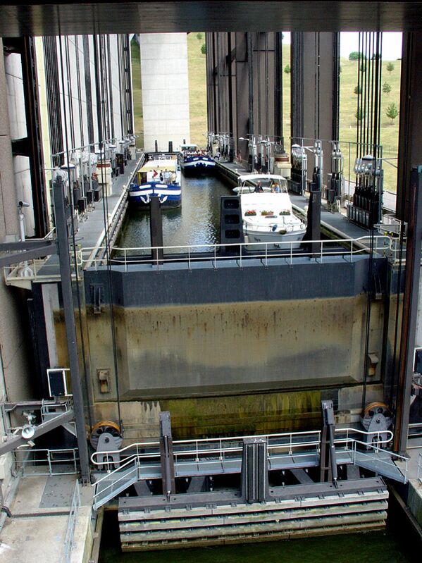Судоподъёмник состоит из двух уравновешенных камер, наполненных водой. Они могут двигаться в вертикальной плоскости независимо друг от друга.[2] По закону Архимеда вес камер не должен зависеть от того, находится ли в них судно или нет. На практике постоянный уровень воды поддерживать сложно, поэтому масса камер меняется в пределах от 7200 до 8400 тонн. Полезная длина каждой камеры 112 м, ширина 12 м, глубина — от 3,35 до 4,15 м.