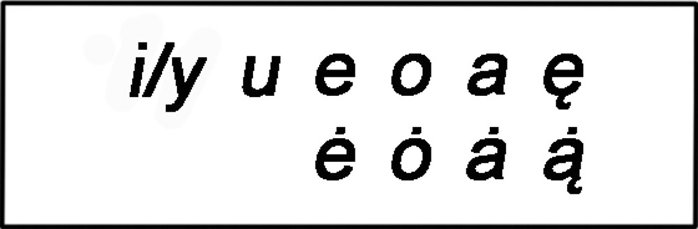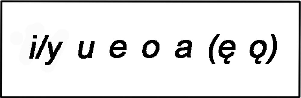 К XVIII—XIX векам система гласных польского языка после слияния «чистых» и суженных гласных ещё более сократилась, приняв современный вид[7][9][~ 2]: